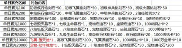 单日累计充值达到10000,可获得:飞翼-堕天使×1、高级飞翼铭刻石×200、飞翼源能石×40、1000绑钻卡×10、1000万金币卡×10