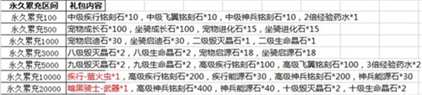 永久累充20000:暗黑骑士-武器*1,高级神兵铭刻石*400,神兵能源石*40,十级毁灭晶石*2,十级生命晶石*2