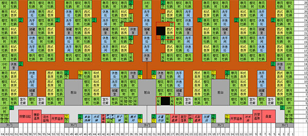 2、布局图上半部分的中间为“商业区”,每种设施仅设一个,以达成所有的契合度组合。即便没有契合度组合的设施,同样安置在此处。两侧是男女温泉区,将全部四种温泉都放置其中,且每个温泉都具备除异性加成之外的六种温泉功效(比如男性温泉不具备花瓣之池和盐之池这两种增加女性契合度的功效)。