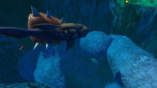 河流上游是极为危险之处,此地是中型体型鱼儿的聚居之所,并且时常有Bonrex出现。所以当你从瀑布飞落时,要立刻朝着前方的河道游去,凭借狭窄的河道来躲避追猎者的攻击。