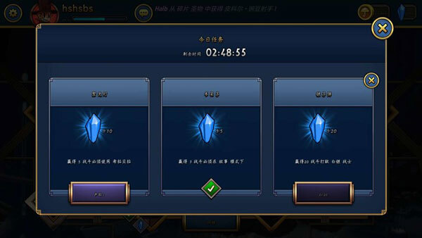 任务:在游戏的大厅页面点击任务可以查看每日任务,这里每天会为大家派出三个任务,完成任务后可以领取到相应的宝石奖励。