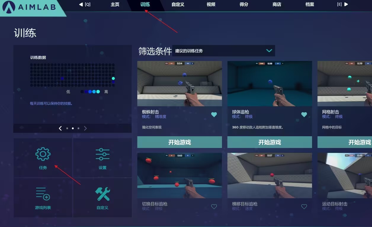 aimlab会根据你现有的能力综合分数,去给你智能推荐六个练枪地图。每天每个地图练十分钟。然后坚持下来,就可以很轻松的提高你的枪法水平。