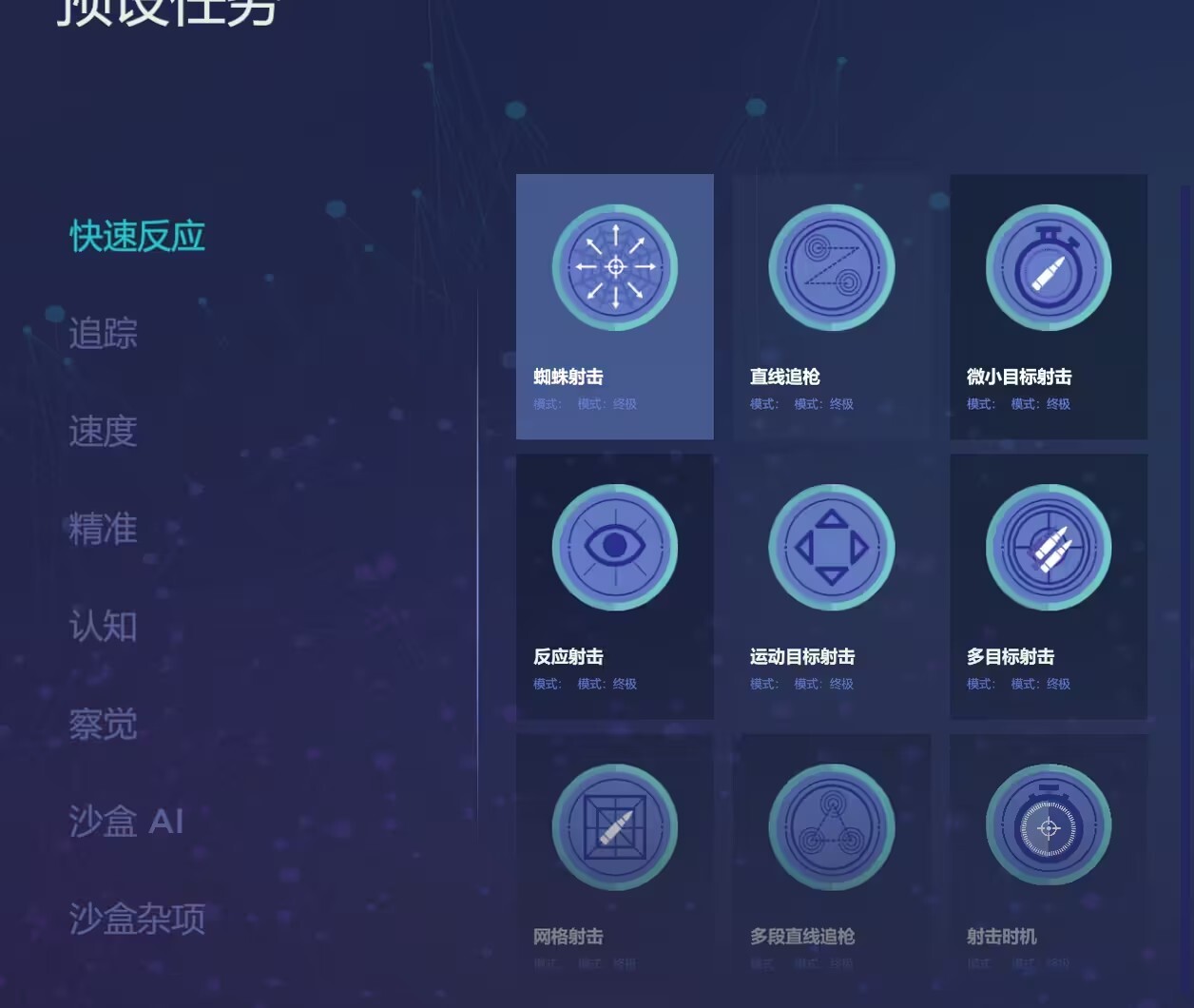 不难发现,地图是依据能力体系进行划分的,总共分为五大块,这五大块与评分体系相对应。每块能力所对应的地图数量,大概在十张左右。这些地图与kovaak和aimbeast里的训练图基本能够匹配,但它更具趣味性的地方在于,针对每张地图,都有详细的训练要求以及训练目标说明。而且,在完成练习后,还会给出细节方面的建议,像是反应速度欠佳、定位速度不足,亦或是预判能力不够,会明确指出哪方面存在欠缺。到了第二天,AI会推送能够提升你所欠缺能力的地图,供你进行练习。