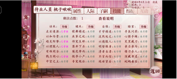 ④每次宴会被太后夸奖/向皇上敬酒获得3个技能点。