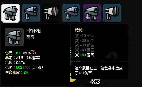 需留意的是,一把顶级(4级)武器,在不少情况下,其效果比不上数量成倍的低级武器。打个比方,在第5波时,若你仅有一把4级手枪,那清怪效果肯定比不上四把1级手枪,甚至还可能因怪物近身围殴而一命呜呼。原因不难理解,1级与4级手枪在前期都能一枪消灭小怪,而且四把1级手枪可凑齐4把“枪械”羁绊,从而获得40范围加成,小怪根本无法靠近,因此在前期,武器数量对刷怪效率起着决定性作用。同理,由于武器从3级升至4级时,伤害无法实现翻倍增长,再加上羁绊因素,个人觉得很多时候一把4级武器不如两把3级同类型武器,4级武器仅有的优势就是节省了一个武器槽位。一把2级武器与两把1级武器的情况亦是如此。所以在前期,最好不要手动合成高级武器。
