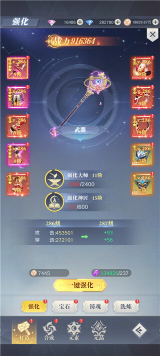 直接铸魂:进入各装备的页面均有一键提升功能自动消耗所需材料对应的铸魂石