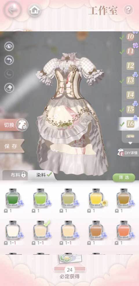 除此之外,游戏中还有更高级的服装制作方法,那就是DIY。不同于以上的固定服装,DIY可以选择更复杂的服装样式,通过更细致的剪裁,展现出更多的细节。