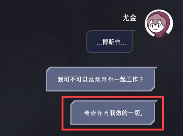 要是你想还我这个人情,那么等抵达目的地之后,你就得听我的√(必选,要是选了第二个选项,不管后续选什么,都会走向“博斯”杀死“尤金”的第五结局,接着“尤金”重生。)