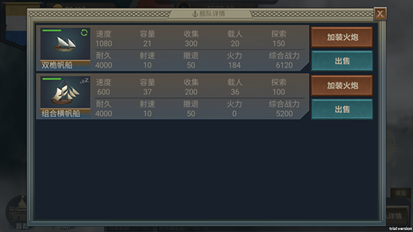 从小型桨帆船到巨大多桅战舰,可对不同战船执行“探索”“贸易”“战斗”任务。提高速度、容量、炮火等技术,找到最适合自己的升级方式。