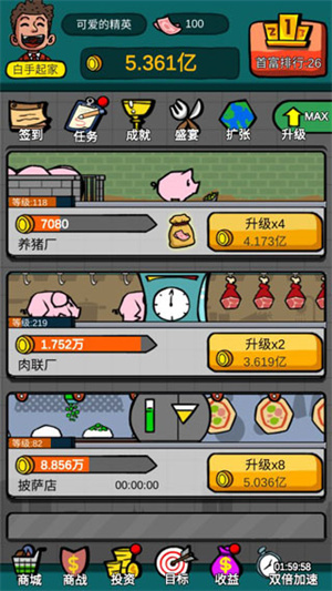在游戏里,玩家的首要目标是赚到10亿。从最基础的开设养猪场、肉联厂、披萨店,到最终涉足石油、珠宝行业,这一系列经营过程,能让你深切体会到经营的艰难。而且,在这期间每成功开设一家公司,都会获得一定的资金奖励。