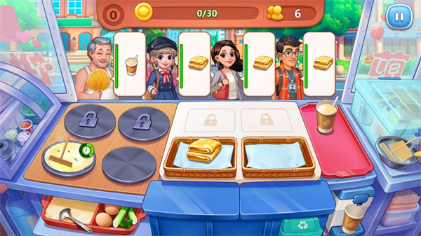 4、挑战方式是:以关卡的方式同样的玩法,继续煎饼子和豆浆给客人。