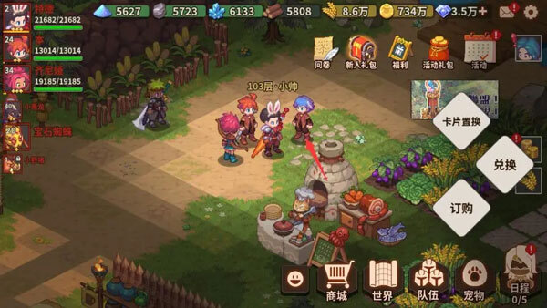 蓝毛小哥——怪物卡抽取处,使用抽卡卷或者钻石即可抽取怪物卡,卡片置换也在这里。