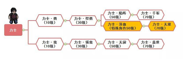 游戏中,力士在10级之后可以转职为【力士·勇】或者【力士·蛮】,具体的转职树如下图所示: