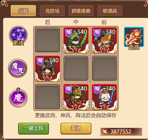 1、布阵:玩家能够借助布阵,安排武将上阵参与战斗,最多能够安排5名武将上阵。武将的出手顺序设定为5个号位轮流进攻,直至战斗结束。主公可在布阵界面调整自身阵容,武将依据上阵位置依次出手。不过,在实际战斗中,出手顺序还需视武将的速度属性以及技能效果而定。此外,布阵还具备其他附加功能,如【阵法、阵营克制、阵营加成、神兵装配】 。