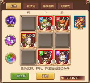 2、阵法:达到一定等级后开启更多阵法阵形,更换阵法来调整出手顺序和受击顺序,战斗中可能会有意想不到的效果。