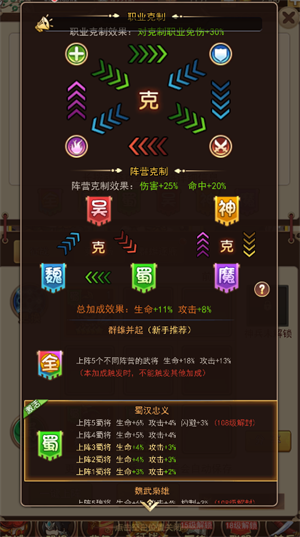 3、阵营克制:主公可根据同阵营来上阵武将,同阵营武将上阵数量越多,激活的同阵营加成属性越多。