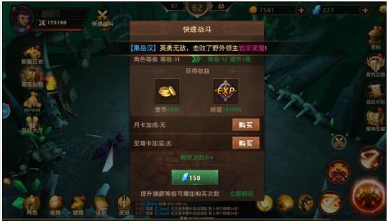 玩家达到指定等级会开启快速战斗玩法,每日一次免费机会,能获得金币和经验奖励,也可消耗钻石购买次数