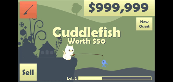 2、钓到鱼后,长按手机屏幕,就可以把鱼钓上来,点击左下角的【sell】出售可获得金币;