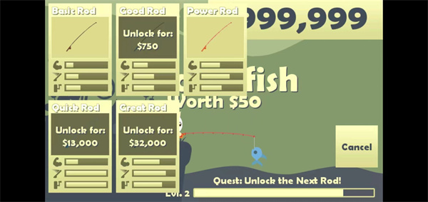 4、当获取到一定数量的金币后,你便能购买渔具。只需点击左上角的【渔具】按钮,如此一来,你的鱼钩就能抛至更远之处,钓到更多的鱼。