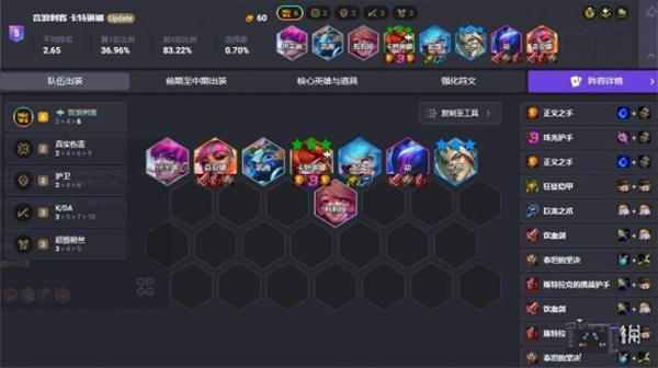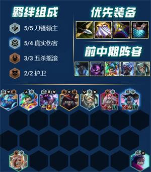 羁绊:5刀锋领主、4真实伤害、3五杀摇滚、2护卫