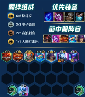 羁绊:6格斗家、3电子舞曲、2音浪刺客、1大触打击乐