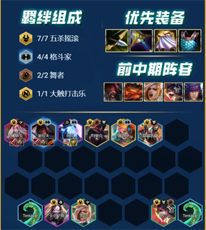 羁绊:7五杀摇滚、4格斗家、2舞者、1大触打击乐