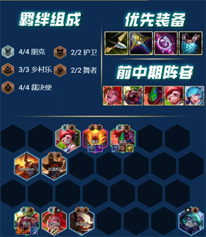 羁绊:4朋克、3乡村乐、4裁决使、2护卫、2舞者