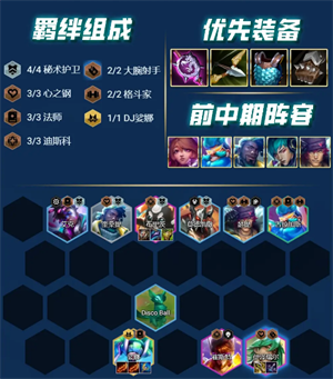 羁绊:4秘术护卫、3心之钢、3法师、3迪斯科、2大腕射手、2格斗家
