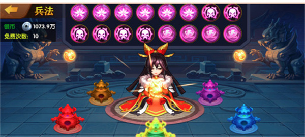 兵法系统:有不同属性的兵法,对应增加的属性也不同,越高级的兵法对应增加属性越多。如此强悍的加成,竟然只需用银币才抽取,大气出奇迹!银币抽顶阶兵法。