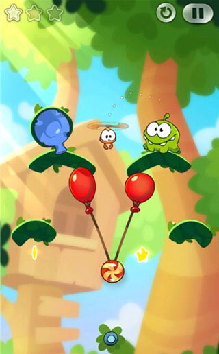 6、当Roto拿到糖果时点破气球,Roto带着糖果向右移动,正好落入怪物的嘴里。