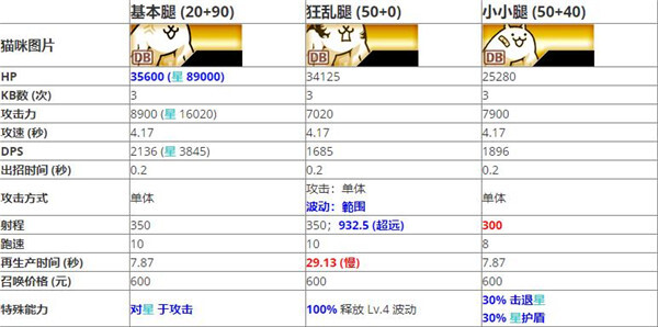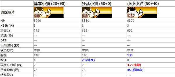 2、小小腿猫的各项数值大多与基本腿猫相近。二者同样都是针对异星敌人的角色,基本腿猫侧重于攻击,小小腿猫则能产生击退的控场效果。相比较而言,在正面对决时,基本腿猫有着更出色的白板数值,再加上侧重于攻击所带来的血量加成;而在控场方面,通常还会面临超能力猫、漂流猫等竞争。
