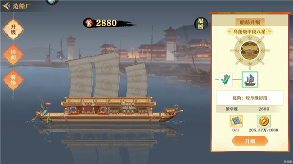 1、首先我们可以进行船舫升级,每次升级需要消耗一定数量的铜钱和道具,升级后可以提升一定的繁华度