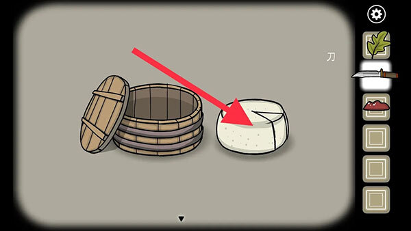 天堂岛内走右侧小道,茅草屋外获得【桶】,进入茅草屋,可以获得【刀】。
