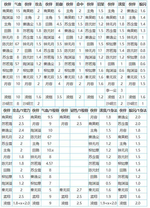伙伴从上到下为优→劣!表格里的数值皆为不溢出加点时!每加1点增加的相应属性值!