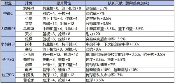 在职业殿堂中,处于队长位置的球员会额外提供一项被动效果加成。而且,职业殿堂里熟练度满格的球员数量越多,队长所具备的被动效果就越发强大!举个例子,如果在队长位置放上“莱昂”,这位球员的天赋技能是“无限高度”,那么所有的PF球员就能得到“分球高度 +1%”的属性加成。同理,在队长位置放置其他职业殿堂的不同职业球员,也会获得相应的属性加成。