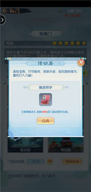 进入不同等级的门派,取决于自身所处的境界。门派中,可用门派技能来兑换秘籍。不过,要是前期氪金较少,兑换五星以内门派的秘籍,实际效果并不显著。因此,前期每天都务必通过门派功绩换到那瓶酒。当角色达到化神境界,进入五星门派后,就能够在几个门派间跳槽学习技能,之后再选定一个有秘籍的门派,专心获取秘籍。(对于微氪玩家而言,需要从前期就着手积攒秘籍书,到合体境界时,就要开始储备酒了。)