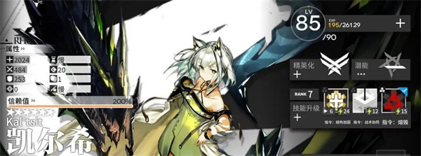 凯尔希:全时期干员,选医疗送群卫。开局建议首选凯尔希,拥有Mon3tr的她全能到令人害怕。抓取凯尔希之后,我们就能避免“输出够多但无治疗”之类的窘境,输出、阻挡、治疗各方面都完全够用,只要之后一心一意存“希望”就好了。
