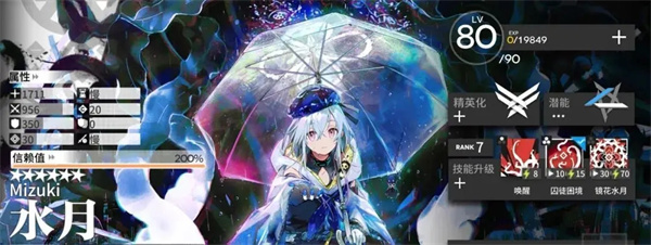 水月在后期作战时,具备范围群伤能力。携带一技能“唤醒”的水月,能够打出大范围的混合伤害,这对肉鸽里大批量出现的敌人有着很好的克制效果。特别是当拿到藏品“极速之手”(周围八格不存在我方单位时,攻击速度提升100)后,水月就仿佛变成了一台高速AOE输出机器。要是获得像上文提到的“童趣玩偶”这类藏品,水月可切换至二技能“囚徒困境”,如同灵知、早露等人一般,借助束缚来进行输出。前中期推荐指数为★★ ,后期推荐指数为★★★★ ,收藏品重要性为★★★★★ 。