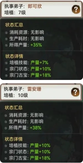 下面以两位不同培植等级(一个7级,一个10级)的执事弟子对比,培植技能差了3个等级,同样是在林场工作,相同时间将拉开3%的产量差距哦~