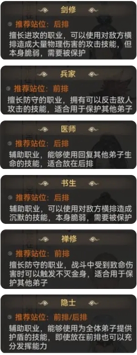 目前游戏中弟子共有10种职业:剑修、兵家、医师、书生、密修、禅修、舞姬、隐士、画师、蛊巫。