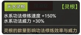 灵根影响对应属性(金木水火土)的【功法】修炼速度、功法威力。