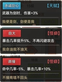 其次呀,咱们肯定得关注他的天赋与怪癖。天赋呢,就是灵根后面那个蓝色的小框框所代表的;怪癖则是红色小框框对应的内容。像剑心、自大、胆小、急性子这类,要是你的剑修角色都具备,那可就堪称天命之子啦[表情_豹哭]。唉,本帮主是一样都没沾上。