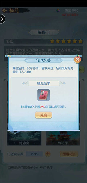 不同境界能够加入不同等级的门派。门派技能还能够用来兑换秘籍。然而在前期,如果你选择氪金,那么五星以内门派的秘籍,换与不换实际上都没有太大作用。所以在前期,每天一定要用门派功绩换到那瓶酒。角色达到化神境界进入五星门派后,就可以在几个门派间跳槽学习技能,之后再选定一个有秘籍的门派,专心获取秘籍。(注:微氪玩家需要从前期就开始积攒秘籍书,到了合体境界才开始储存酒。)
