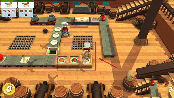 热气球2-2中,把菜放在生虾的箱子上,玩家可以隔着围栏拿到它然后上菜。