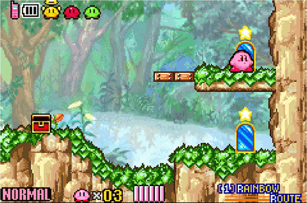 你操控的卡比剩余生命数存在这样的设定:每当健康值归零或者坠入深渊,生命数就会减1 。在生命数尚未降至0时,每次减少都会将你送回刚进入该房间的位置;而当生命数达到0且再次减少时,便会把你送回镜之国的入口。