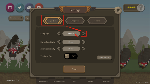 跳转至页面后,第一步点击【Game】,接着点击【>】,直至看到“Chinese”这个英文出现,此时便意味着已切换为中文,最后点击【save】进行保存。