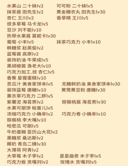 4、若配方里包含特定食材,不可替换成其他食材。除海绵蛋糕与果冻之外的基底,若你没有,便不会在食材列表中出现。而未出现在食材列表里的基底不会显示,自然也就不能用硬币或道具进行升级(不过通过售卖的方式还是能够升级的)。因此,稀有的基底不妨留一个暂不使用,这样方便升级。另外,要留意“蛋糕卷”和“瑞士卷”的差异,“蛋糕卷”指的是之前汉化版中的“年轮蛋糕”,并非官方中文版里的“瑞士卷” 。