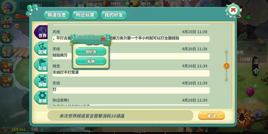 下方有五个小标,都可以点击,会看到有其他玩家分享实时消息。玩家会有红色标识,如果想要加好友,只需要点击昵称上方的系统就可以加好友或者私聊了,这是在系统小标内的操作。在世界中,玩家只需直接点击昵称就可以看见加好友的页面。