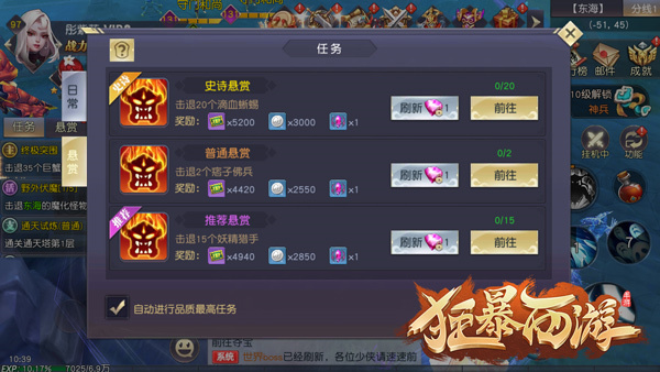 1、悬赏任务每日系统会随机生成,玩家可以选择手动完成或自动完成;