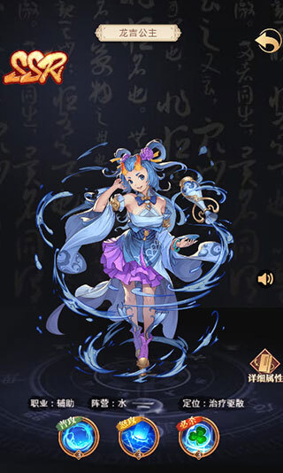 回血净化型辅助,前期较为强大的回复能力,同时能驱散队友的负面状态和加快怒气回复,比较全面,而且获得的概率很高,能搭配的阵容很多,无论推图爬塔还是竞技场,在阵容为完全成型时,可作为万能替补为阵容带来不错的收益。
